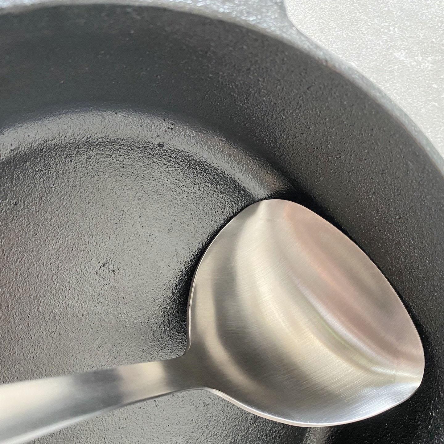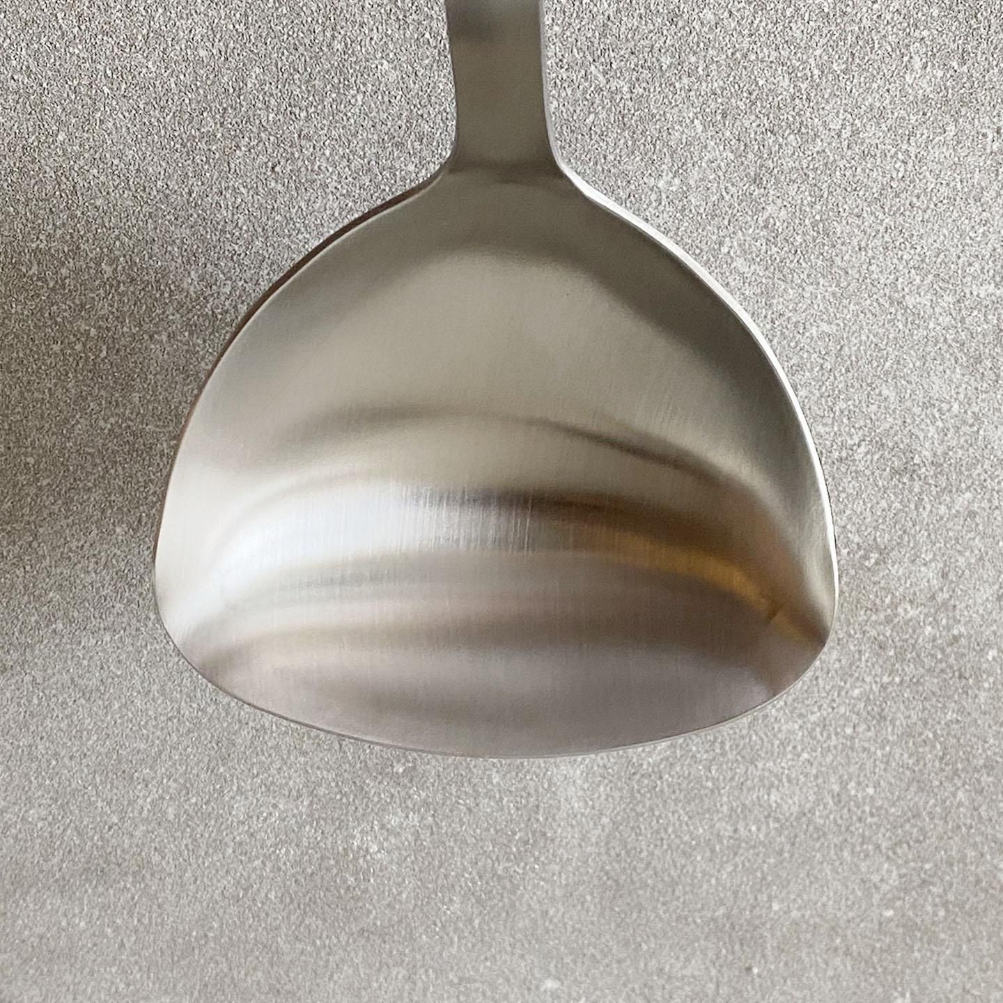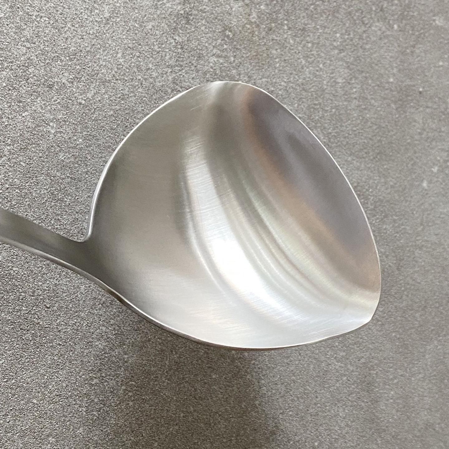 レードルの両端に角があり、鍋の側面とカーブとの間に隙間をできにくくすることで、しっかりと鍋の中のお料理をすくうことができます。また、角の部分がちょっとすぼまっていて、液体の注ぎ口にもなり、カレーなどで具だけ取りたい時、液体だけすくいたい時などの調整がしやすく、人数分でちゃんと分配したいときに便利です。