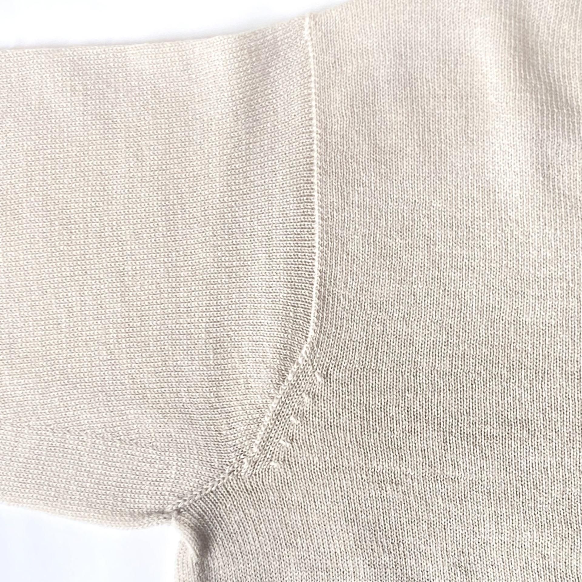 襟元はリブ編みのボトルネックタイプ、裾もリブ編みで両脇に小さなスリットが入っていて、男女問わず着用可能です(モデルは158cm)。軽やかな薄手のニットなので、厚手のコートやダウンの中にさらっと着ることができる便利な1枚です。